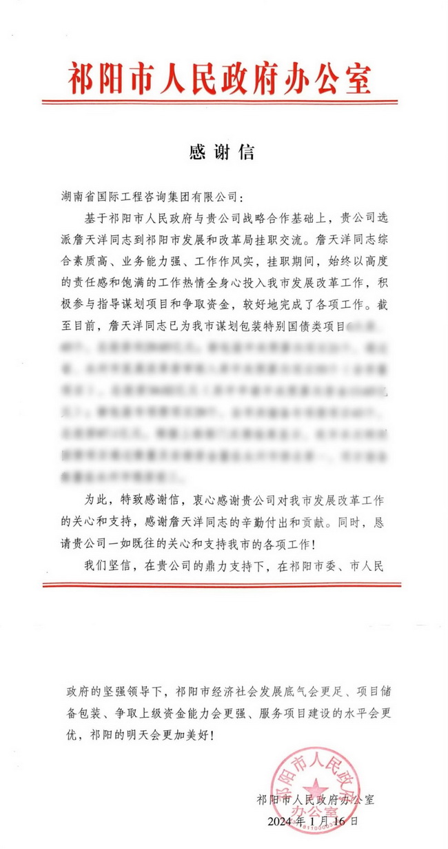 近日,湘咨集團接連收獲省發(fā)展改革委、祁陽市人民政府的多封感謝信,信中對湘咨集團廖江威、梅盛、詹天洋三位同志主動服務(wù)、勤勉敬業(yè)的工作作風(fēng)以及良好的綜合素質(zhì)表示肯定與贊賞,對湘咨集團一直以來給予的關(guān)心和支持表示衷心感謝。
