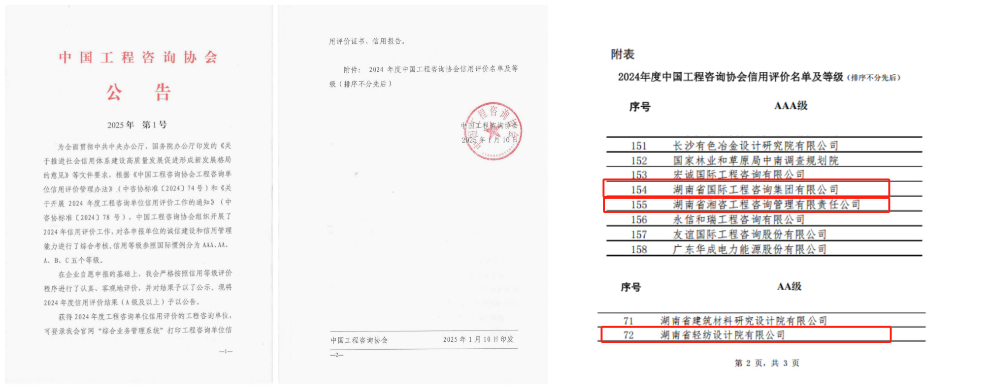 2025年1月10日,中國工程咨詢協(xié)會(下稱“中咨協(xié)”)發(fā)布2025年第1號公告,湘咨集團(tuán)成功獲評2024年工程咨詢單位信用評價等級AAA級。據(jù)省咨詢協(xié)會統(tǒng)計,湖南此次共7家單位獲評AAA級,4家單位獲評AA級,其中,湘咨集團(tuán)獲評2家AAA級(本部及湘咨管理公司)、1家AA級(省輕紡院)。